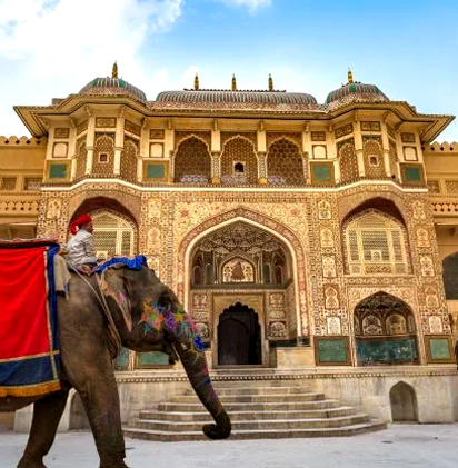 A celebration of Rajputana glory with courtyards, jharokhas, hand-carved elements, and warm sandstone textures.